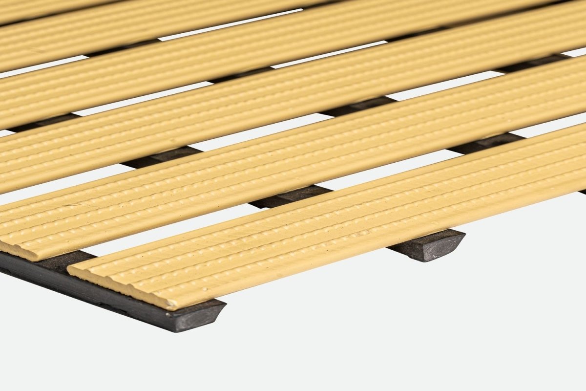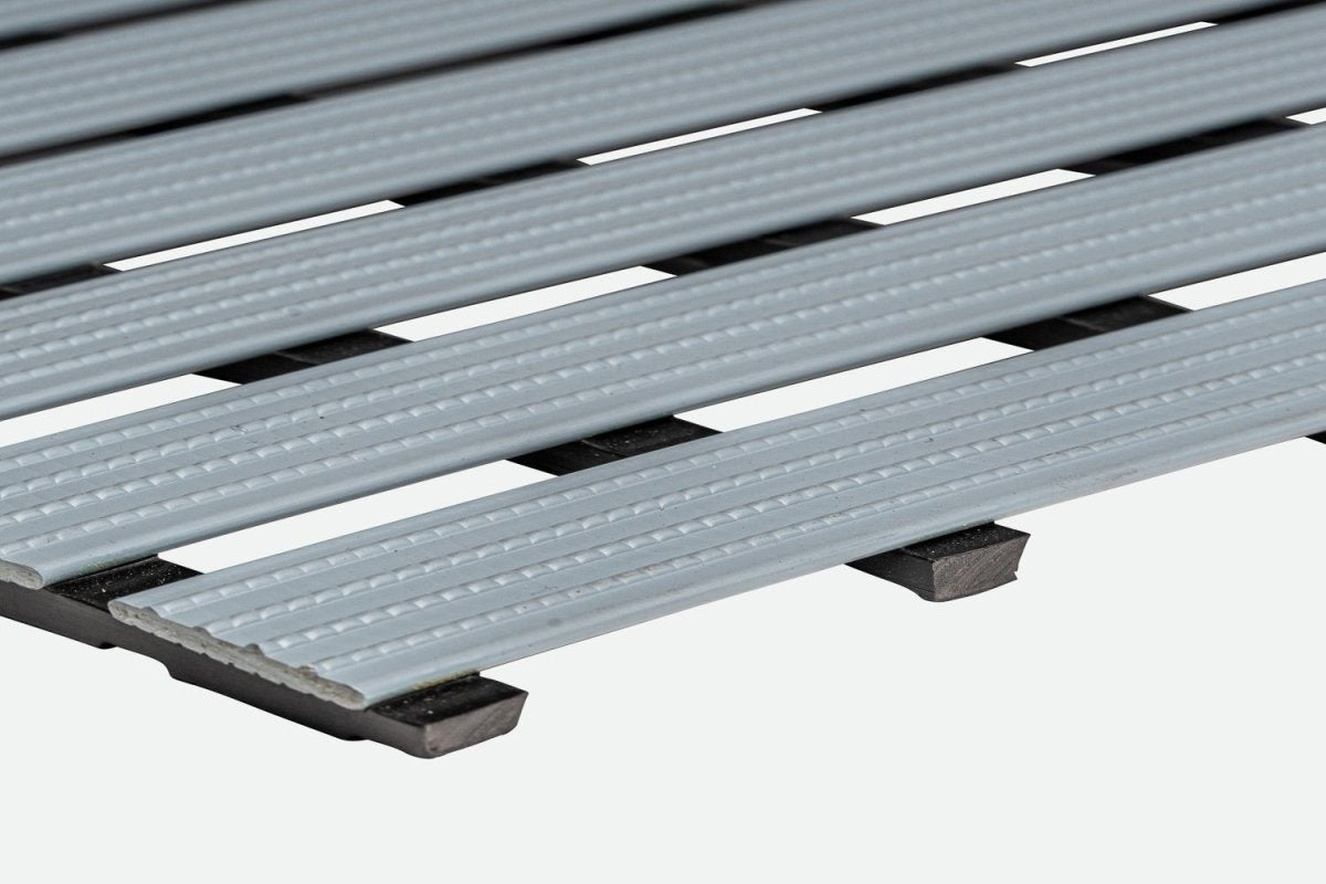 - Strong, impact resistant, flexible duckboard mat with a unique cross-ribbed design for barefoot hygiene, comfort, and stability